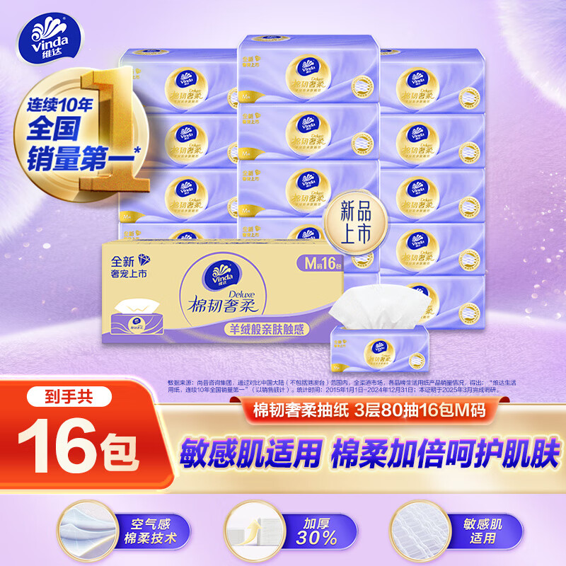 维达 抽纸 棉韧奢柔3层80抽*16包M码