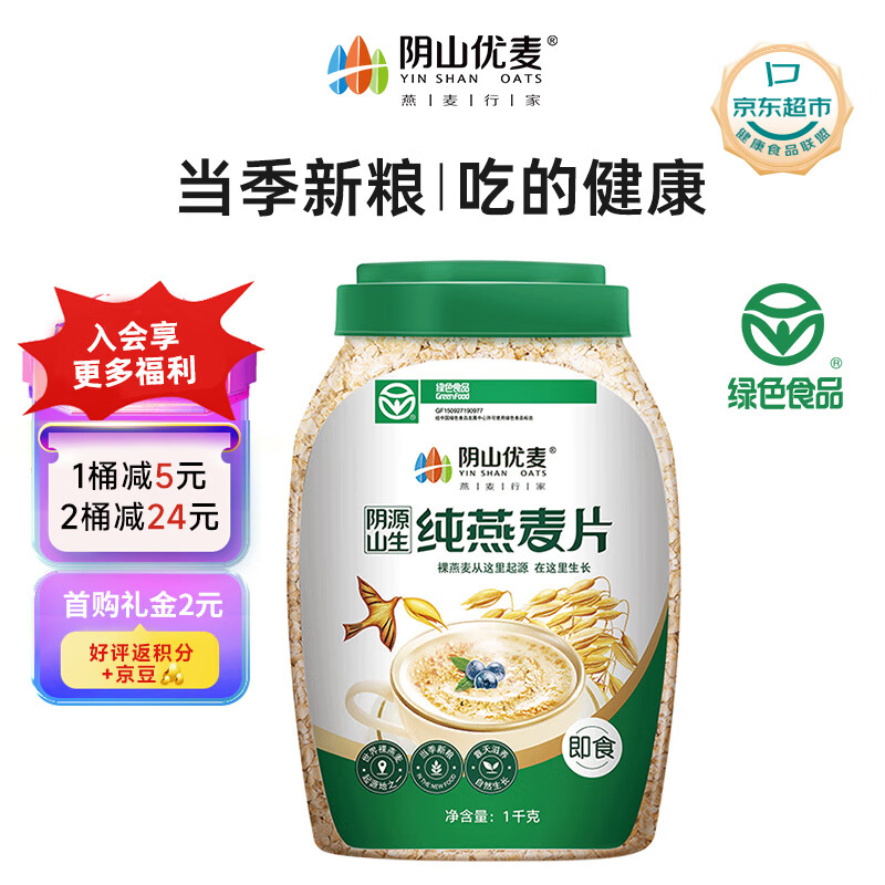 音山优麦纯燕麦片1kg*1桶,2件,单桶0.28 亓