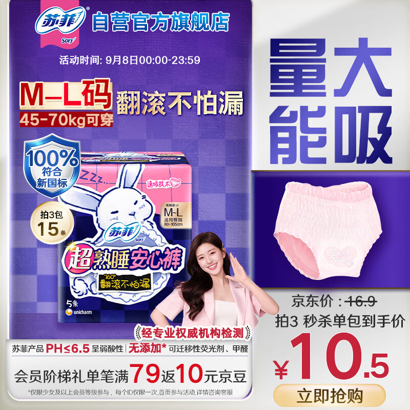 苏菲超熟睡兔子安心裤超薄安睡裤M~L均码5条