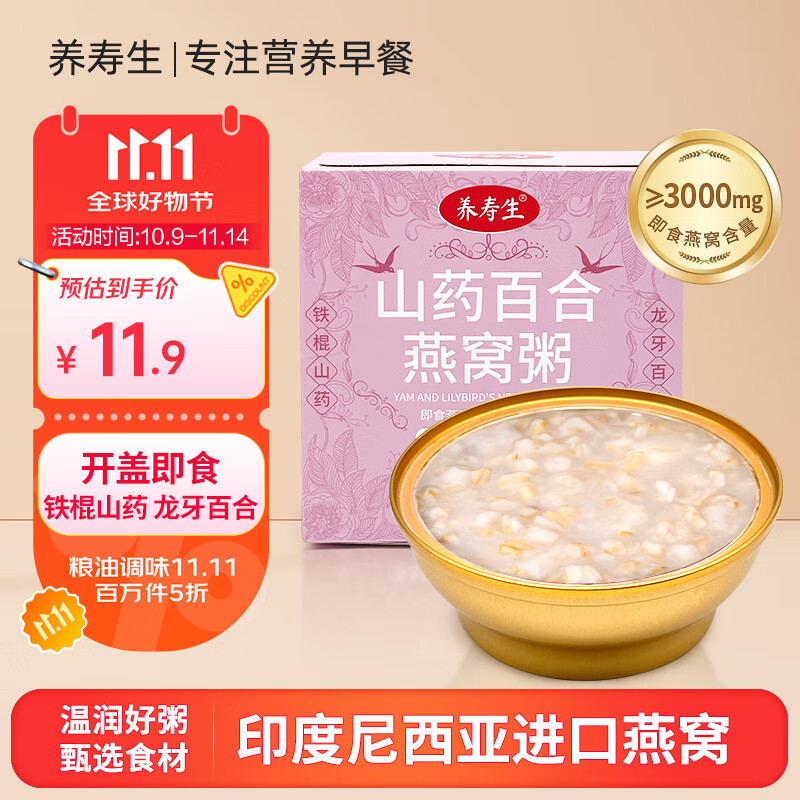 养寿生山药百合燕窝粥160g,部分用戸弹出13-12劵,买2件0.35