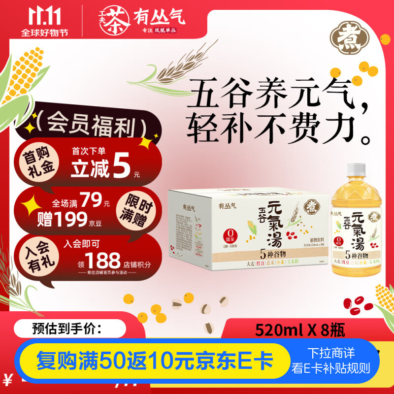 有丛气五谷yuan气汤植物饮料养生水 520mL*8 ,入会积分兑换139-10奍,拍5件,凑200-20后,每件8
