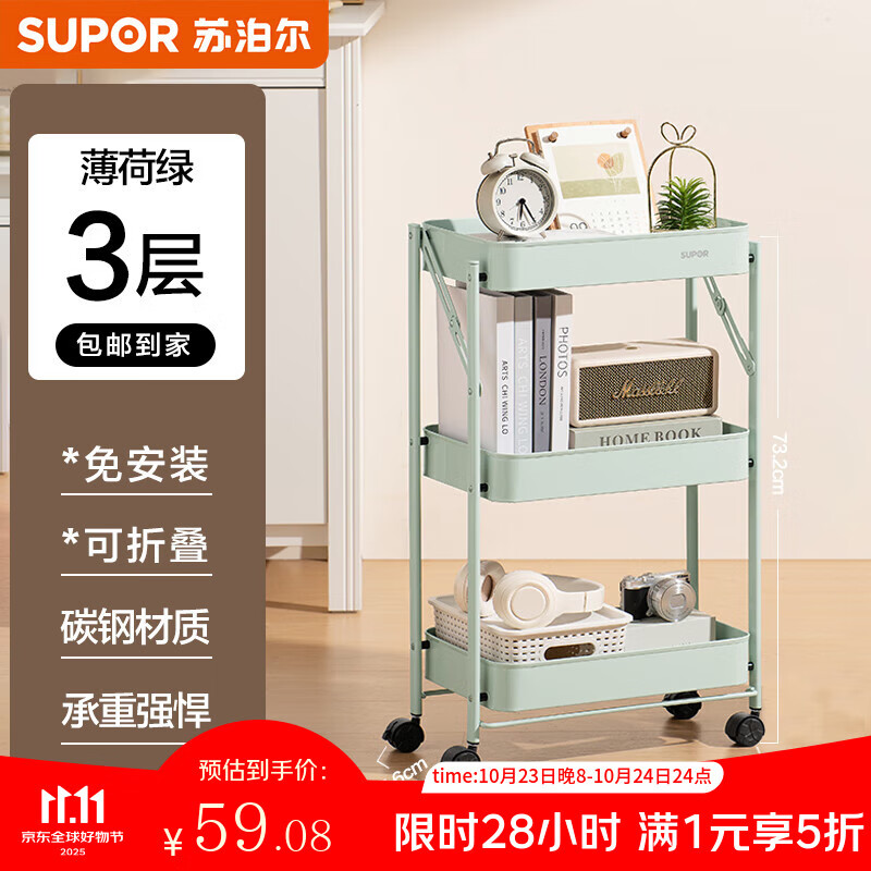 苏泊尔厨房置物架碳钢收纳折叠小推车薄荷绿客厅三层收纳架
