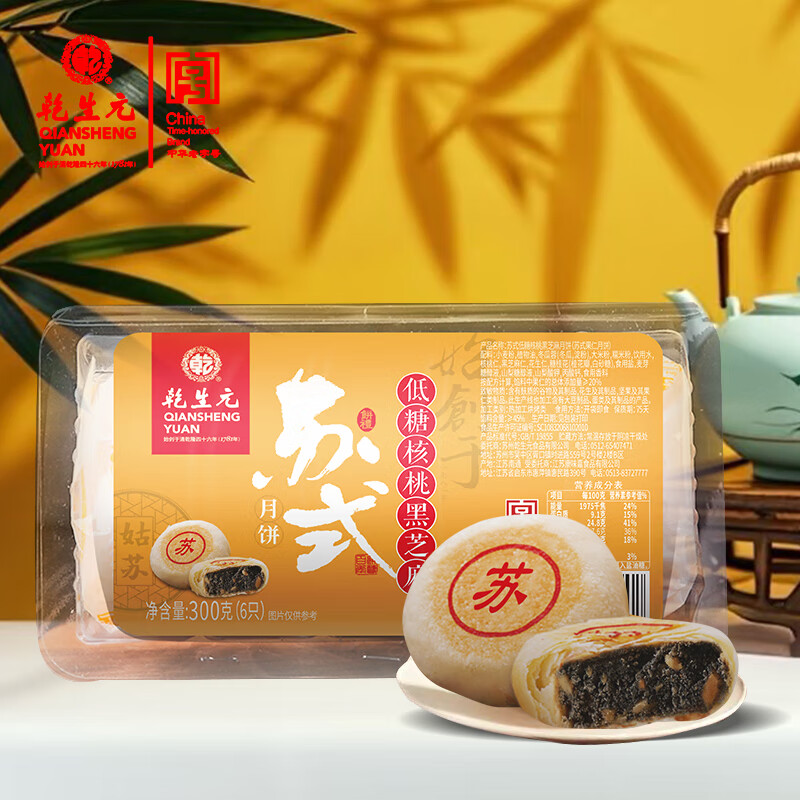 乾生yuan低糖核桃黑芝麻6枚卷装苏式月饼300g