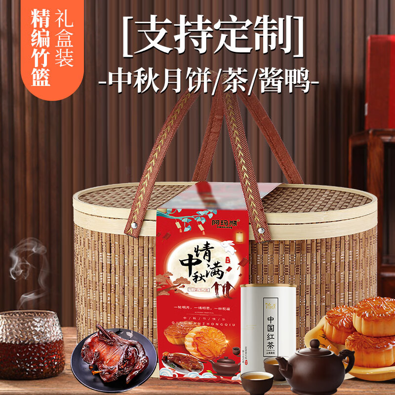 阿玛熊 竹篮中秋礼盒1180g酱鸭 茶叶 广式月饼蛋黄